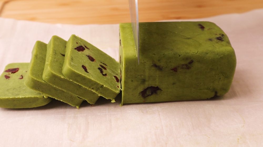 4. 另外一份面团里面筛入5g抹茶粉,加入25g蔓越莓干,揉成长条放入油纸之后放进模具中压平整,然后放入冰箱冷冻1个小时