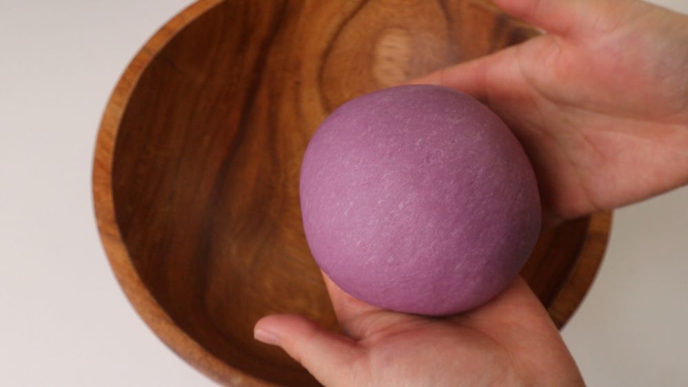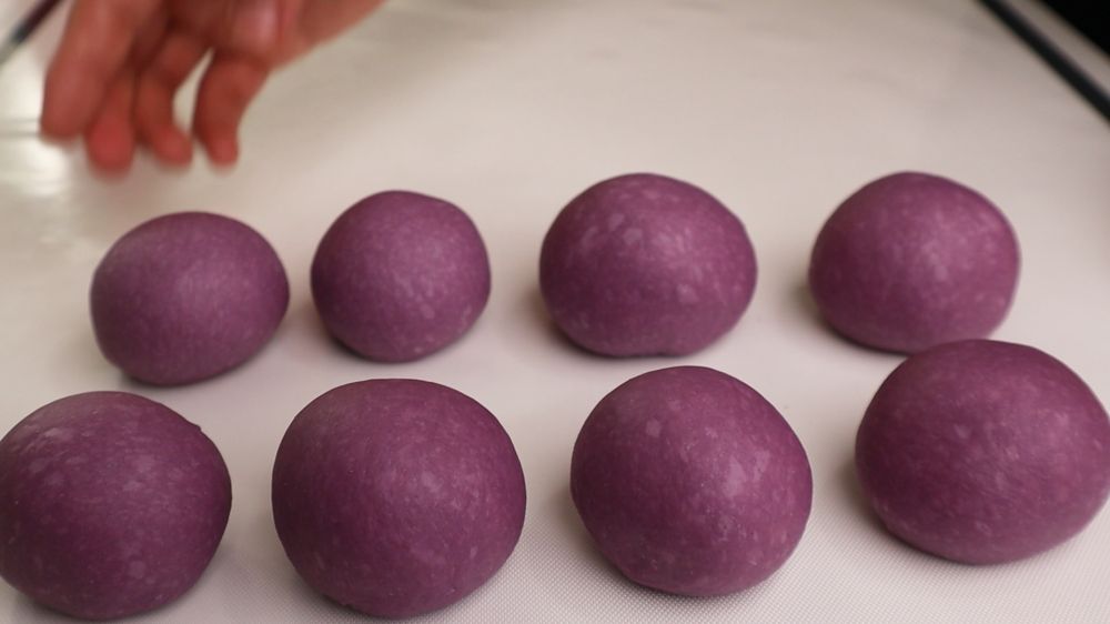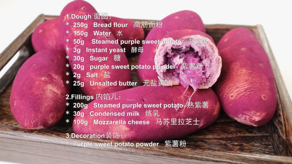 1.Dough 面团: * 250g Bread flour 高筋面粉 * 150g Water 水 * 50g Steamed purple sweet potato 熟紫薯 * 3g Instant yeast 酵母 * 30g Sugar 糖 * 20g purple sweet potato powder 紫薯粉 * 2g Salt 盐 * 25g Unsalted butter 无盐黄油