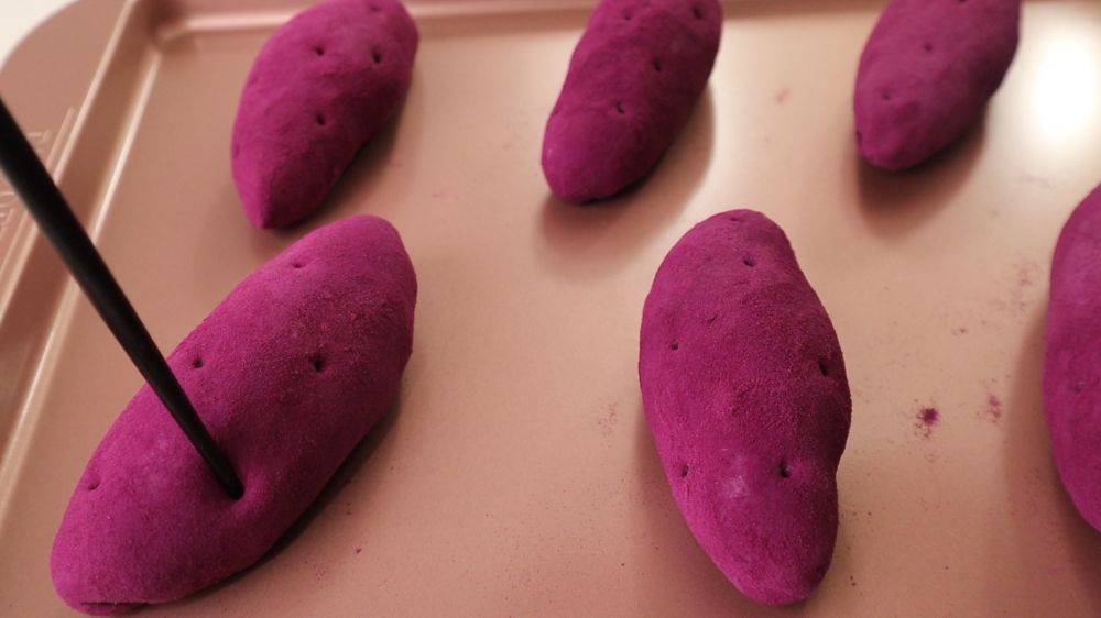 6. 包好之后在紫薯粉里面滚一圈,裹上一层紫薯粉,然后放在烤盘里面,用筷子撮几个洞,尽量深一点,不然醒发完之后就会恢复