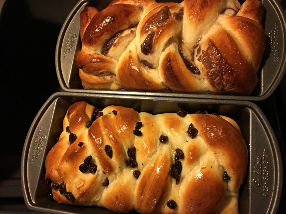 简单说一下做法:酵母先溶于温牛奶,搅匀静置10分钟,然后依次加入牛奶,鲜奶油,糖,鸡蛋,奶粉,面粉,盐到面包机,用dough 档揉第一次后加入融化的黄油,再用dough 揉第二遍,最后完成发酵,面包整形,二次发酵(保鲜膜盖好放烤箱里开灯放盘热水,约40分钟),涮蛋液,350F烤26~30分钟(请按自己的烤箱调节时间)