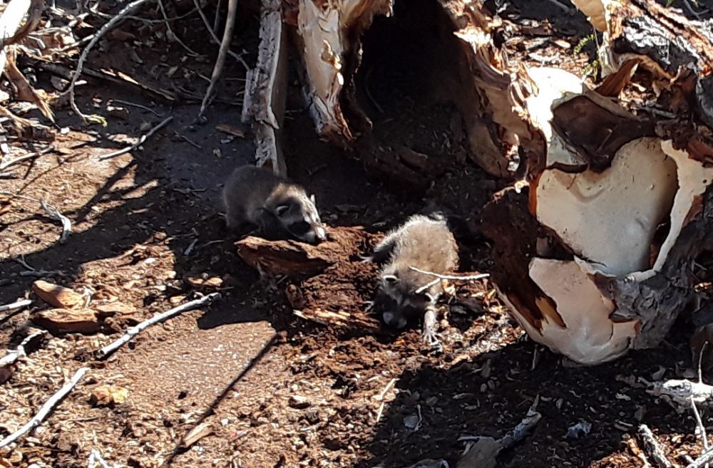 后来改主意裁了一节原来的窝把三只放在里头。并把哪节窝挪到树桩旁,希望妈妈RACCOON会回来带走它们。