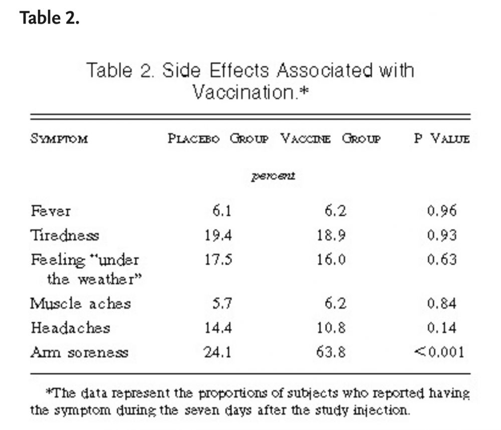 这是流感疫苗及空疫苗对照组的副作用比较,但今天我们不是看两组之间的差别,而是看副作用整体上在一个什么层次。我们可以看到,接种疫苗之后发热的人的比例在6%左右,全身表现里乏力的情况最为常见,也不到20%。