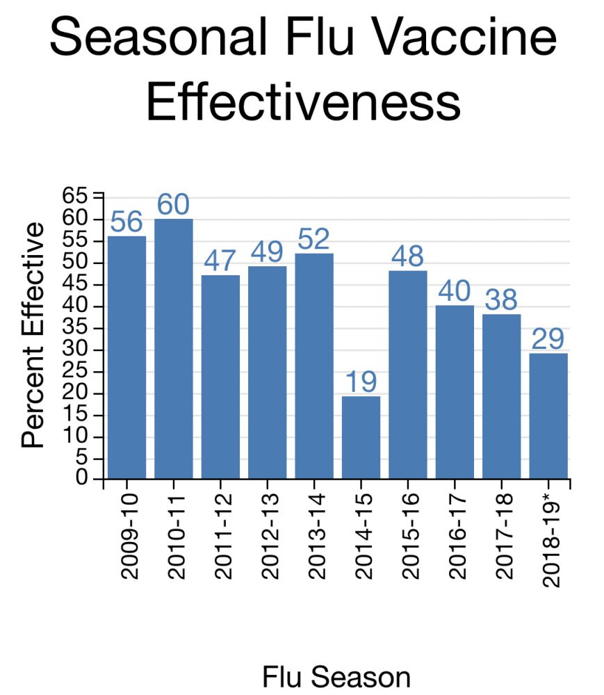 对于问题1,大家都清楚流感疫苗的有效性不像其它疫苗那么高,每年还有所不同,但是基本上都在50%左右徘徊(见下表)。也正是因为一半一半的缘故,有些人会理解为打了疫苗,我得流感的机会是一半一半;那我不打疫苗,结果也是得,或者不得,那也是一半一半。乍一听,好像有些道理。实际上,疫苗是在预防层面,更合适从群体的角度去考虑。比如说你周围的人不得流感了,你得流感的机会自然也就少了。