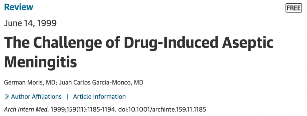 查阅文献发现,除了细菌、病毒和真菌引起的脑膜炎之外,还有一种特殊的脑膜炎——药物引起的脑膜炎(Drug Induced Asceptic Menigitis,DIAM)。