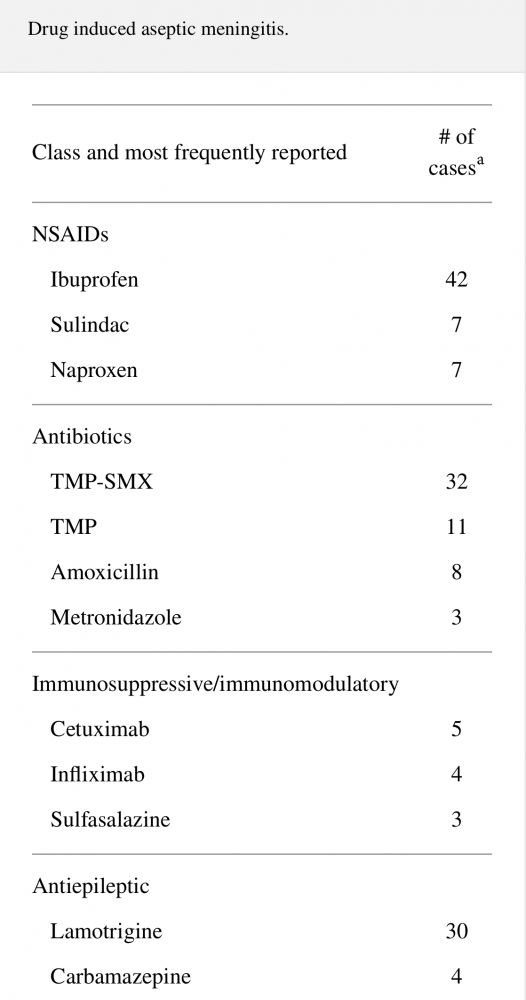 第一例报道的药物引起的脑膜炎是在1978年,药物是大家熟悉的布洛芬。而Bactrim的首例是在1983年,病人服用了一剂的Bactrim之后就出现了头痛,颈项痛,恶心和呕吐的情况。布洛芬是最常见的,而Bactrim紧随其后,然后就是抗癫痫的药物Lamotrigine(拉莫三嗪)。