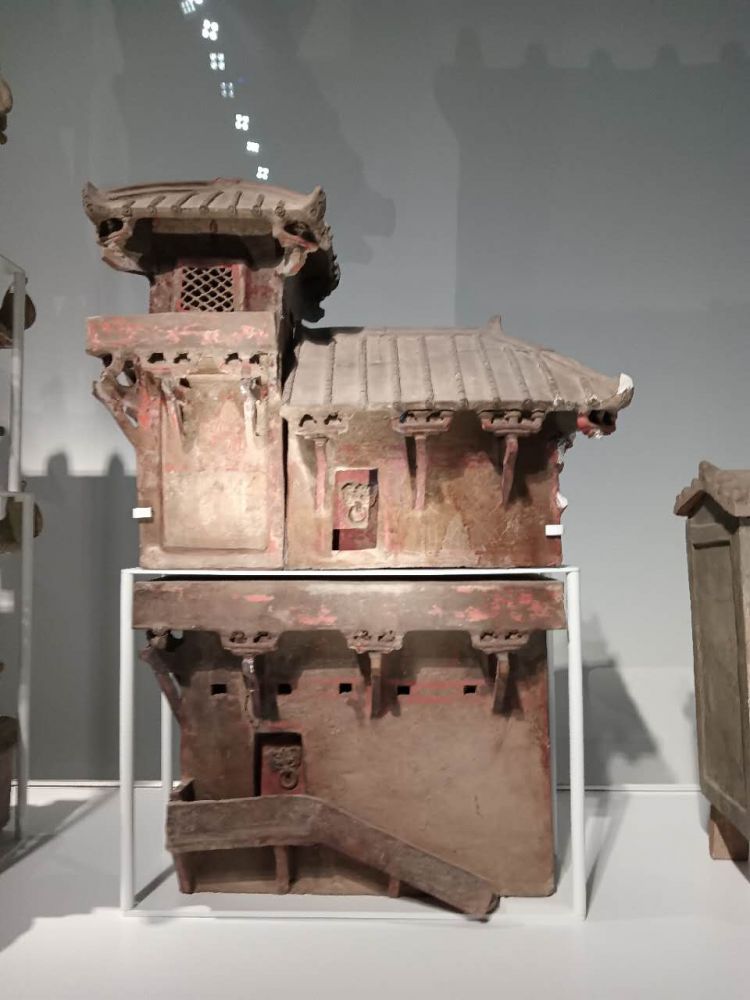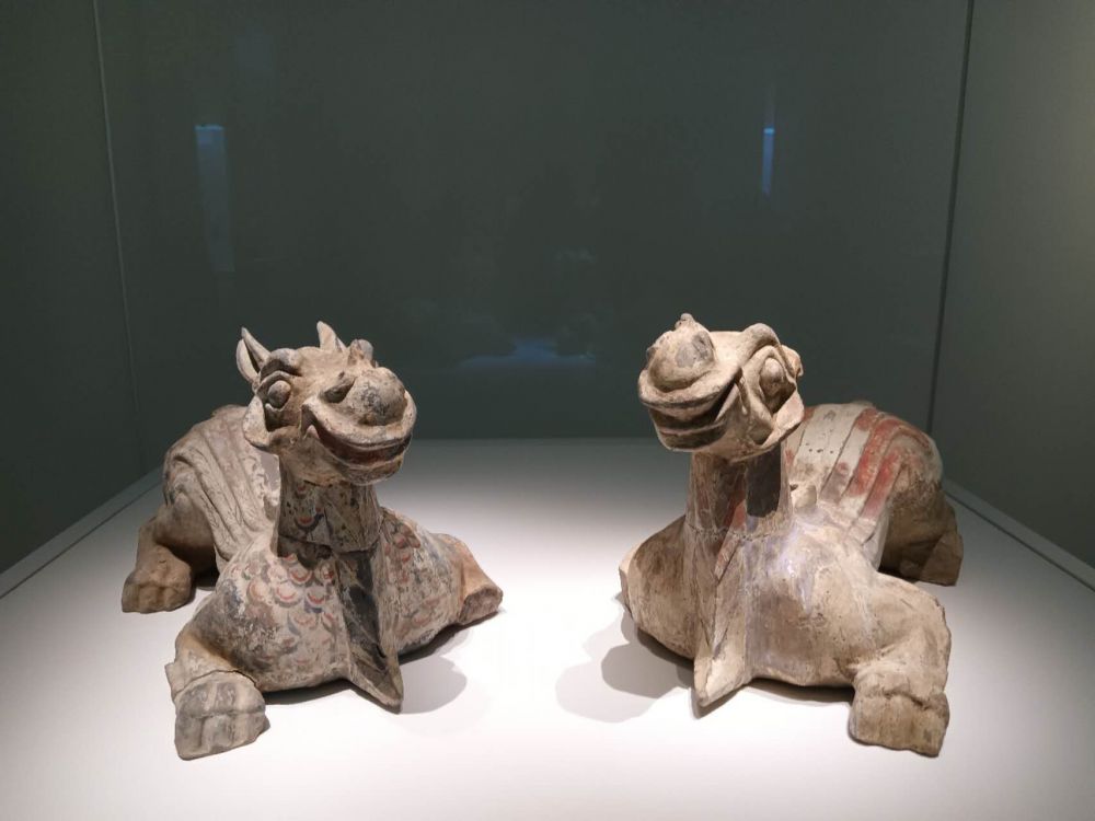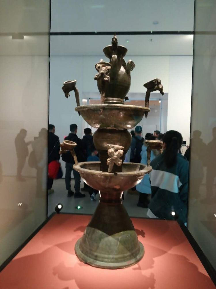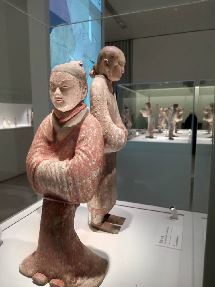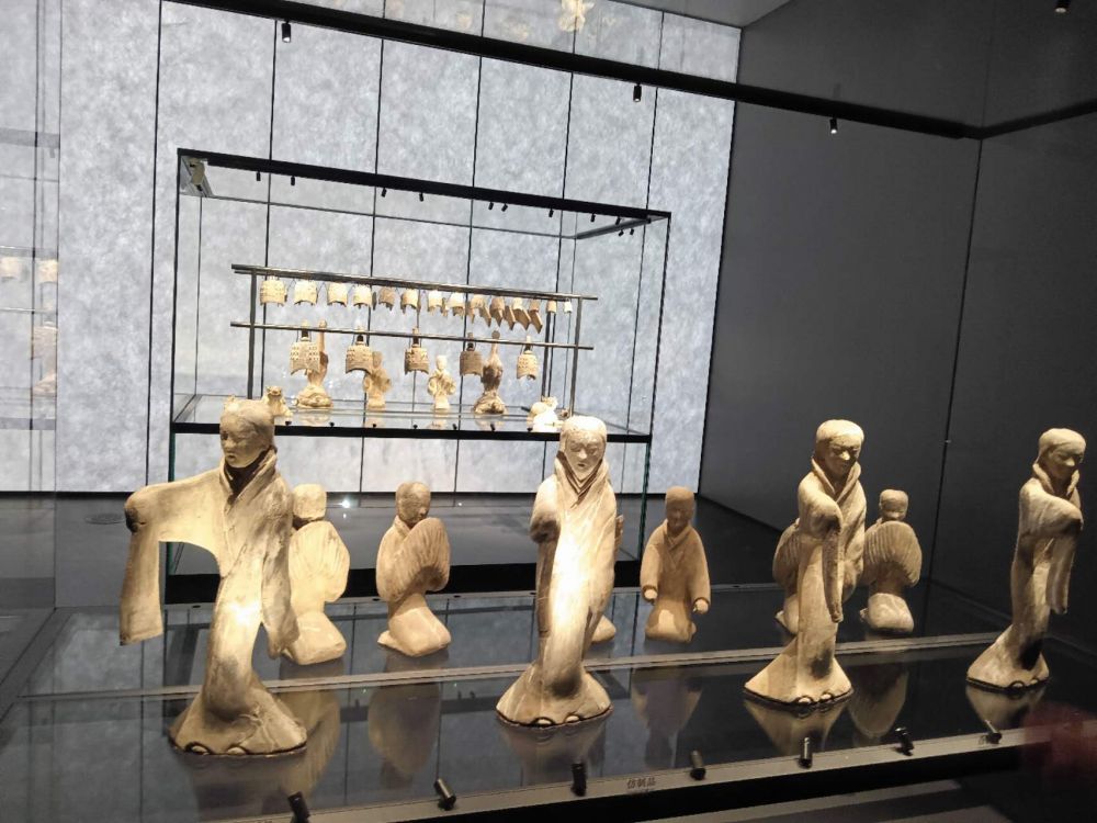 小注:我因为自己跳一点广场舞,特别留意汉俑歌舞伎的样貌。对展馆专门找今人演绎陶瓷歌舞伎动作的录像,感觉特别有意思。依我看,那舞蹈者,舞姿高雅柔和,应了那句“歌之咏之不足,而舞之蹈之。”我都想把这视频给广场舞姐妹看,让她们瞧瞧一千多年前的舞蹈者的动作。且慢,别让人家觉得太酸了。。。