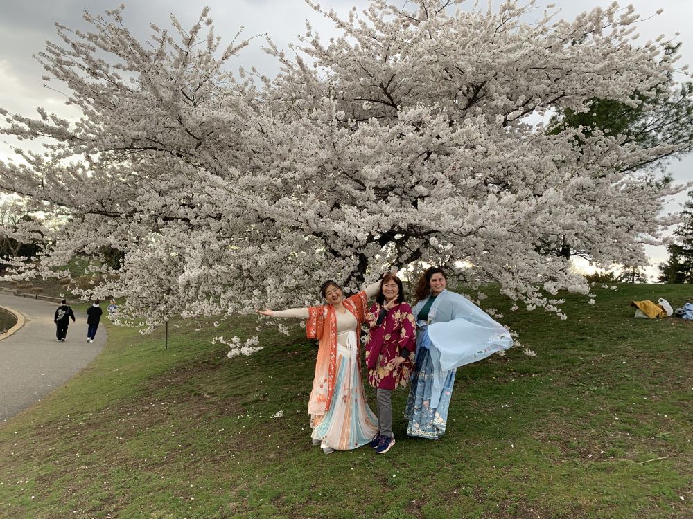 绕着树心慕慕地走,遇到一位六七十岁的亚裔大姐在对着它拍照不停,我就跟她聊起这里的樱花来。我告诉她我准备晚上九点或明早七点来自拍樱花,我车里还带着和服和汉服,但此时不敢拿出来穿照,怕美国人觉得是行为艺术。那大姐热情地要我去拿来衣服装扮起来,“此时人少!美国人见多识广不会反感的!”于是,我就拿来和服与汉服,跟那大姐,和边上一个锻炼的感兴趣的西班牙女孩,三人任性过了一把汉服瘾和服瘾,与樱花来了场美丽约会。