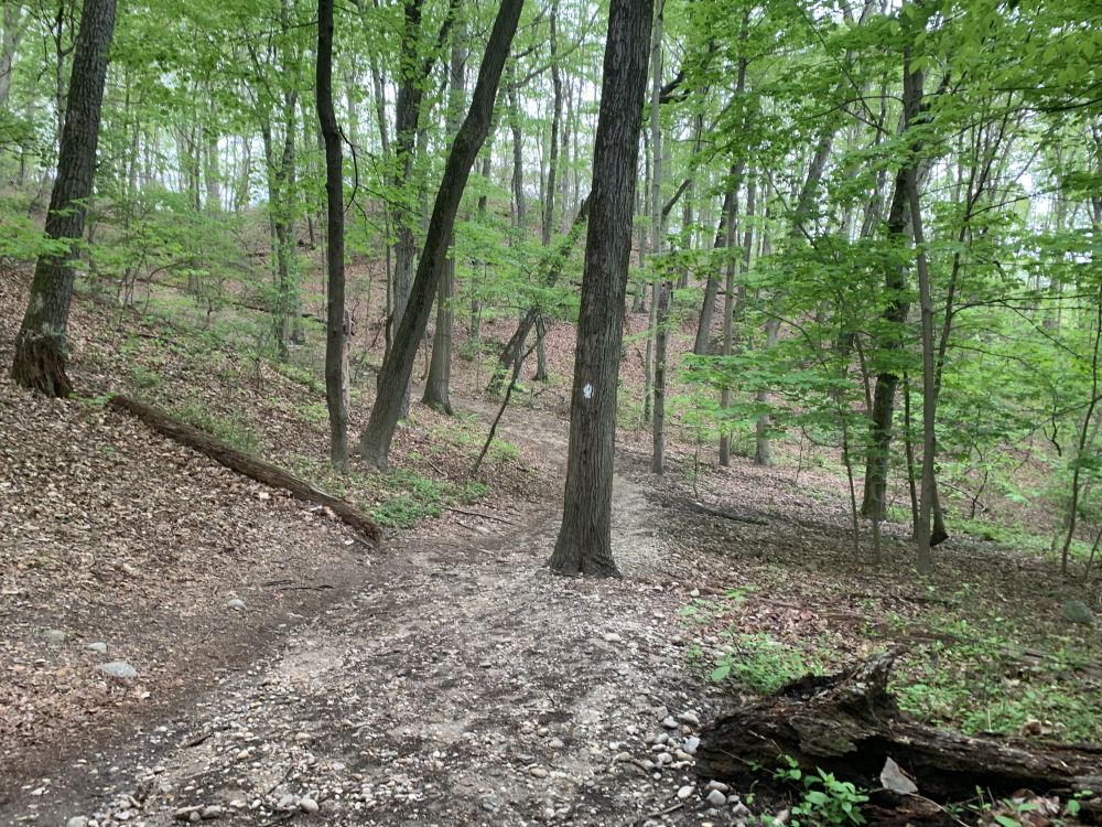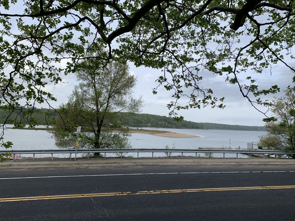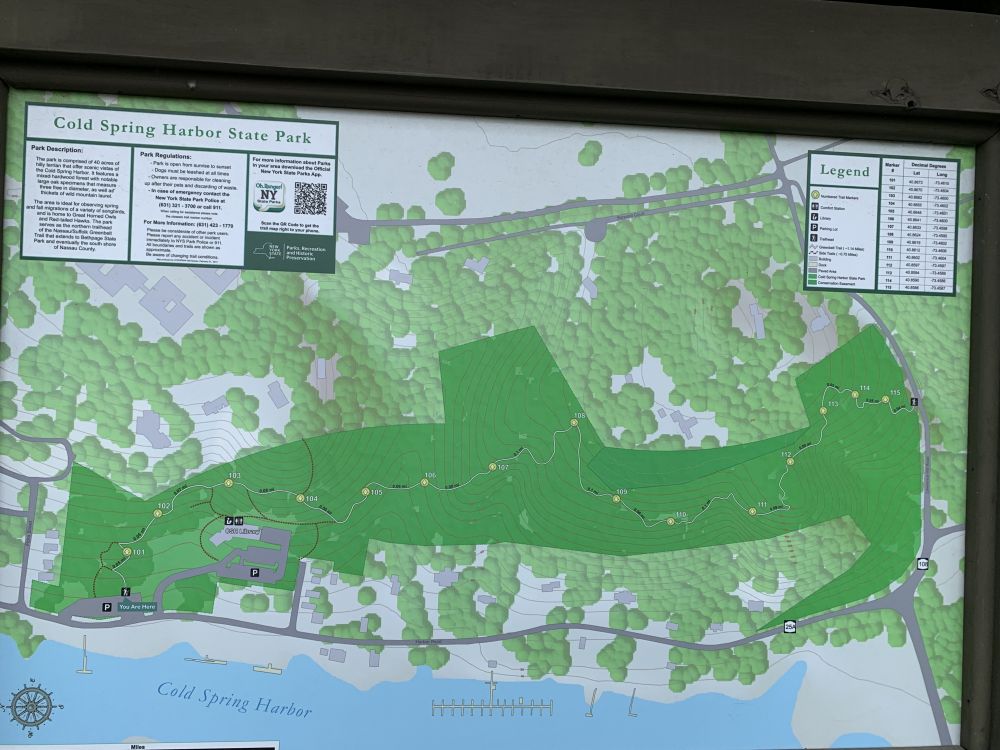 我爬的这小山属于Cold Spring habour state park,它坐落在Cold Spring小镇边上。边上是平静美丽的港湾,有各种自有小船/游艇等的停泊处。快夏天的时候,很有点儿千帆等待竞渡的势头,也有船屋,售卖各种航船用品。我看过,价格不菲(如船用小雷达啥的),不玩船也用不到,即玩船的非富即贵吧。这山上一般很安静,停车处越能停25辆车,早七点多一般都停不满。
