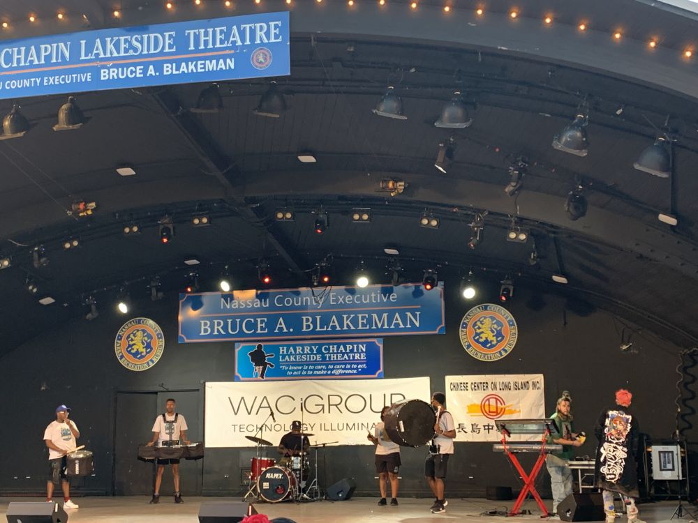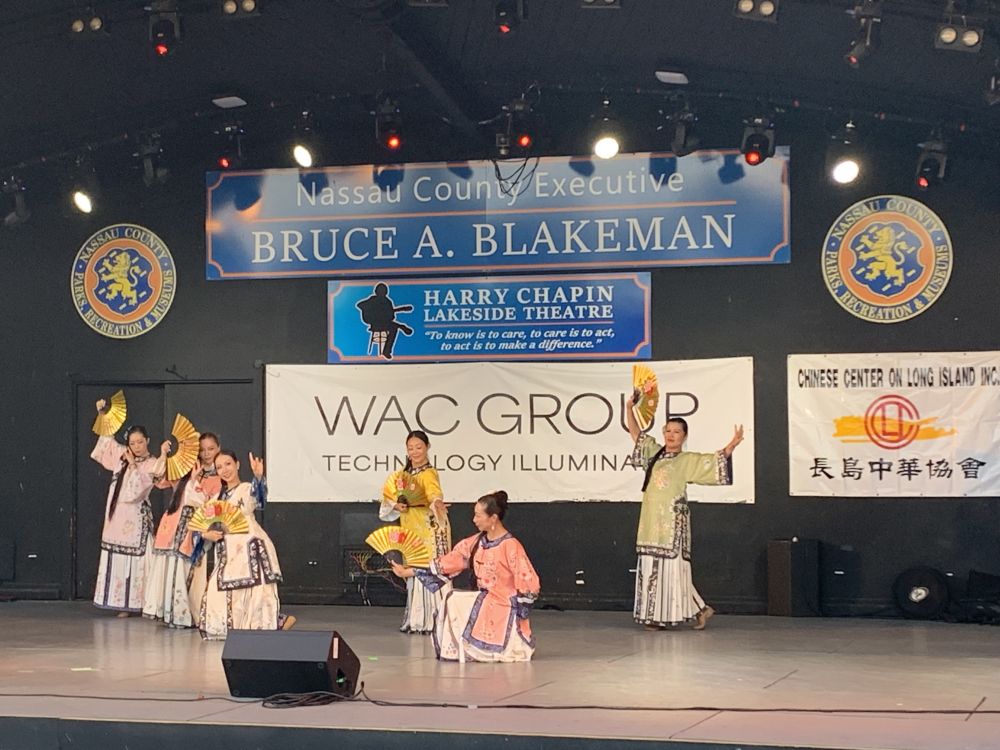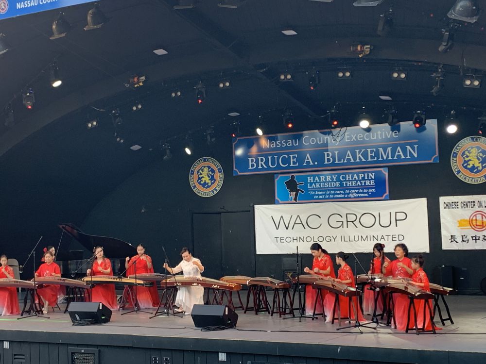 此时,台上一个个中国文化节目:有soysset 镇表演队的舞蹈“京剧舞蹈”,有长岛某老师主理的古筝表演队表演的古筝曲“大鱼”等,有某民乐团演奏的“金蛇狂舞”等,还有某舞蹈协会青少年表演的舞蹈“六月青荷”等等。这些都是传统些的表演。每个表演组老中青结合,甚是说明中华传统古筝/器乐博得各年龄层中国移民的喜爱和传承。当然也有新锐青年演唱的粤语歌曲,及融入美国街头乐队文化的一个男小提琴手。他和和他的乐队,四五个黑人拉丁裔鼓手架子鼓手们,一个亚裔女萨克斯风乐手,合奏中国歌曲或美国经典歌曲(哈利路亚),合着演奏者们高能的舞步和节奏,他们的演绎是对中外歌曲进行重新编曲和演绎的做法,获得了台下年轻人们的热烈掌声。紧凑的晚会很快就进行完了!感觉节目丰富,紧凑!虽然台下有两百观众样子,很多还是演员们的家属和后勤部队,但长岛那么大,散布在其中的中国人家庭和中国人社团还是有一些的,足以撑起一台内容丰富的晚会。观众里有几个欧亚混合家庭的身影,但大多都还是中国人家庭。妈妈爸爸爷爷奶奶们很小心啊操持着小演员们的服装准备/椅子座位/食物饮水等等。看来,很多都是全家参与的集体行动呢。
