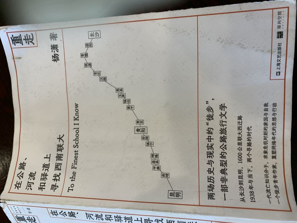 (重走)是一本厚厚的中文书,副题(在公路.河流和驿道上寻找西南联大),作者杨潇,是一位北大中文系毕业十几年,一直做文字工作的记者/作家/背包客。读完,我深为感叹,游记就应该这么写,每每到一个地方,往前几百年历史人物,往前八十年历史人物,现今状态,归结到一处,才真正博古通今地看那地方,写那地儿的游记。本书作者真正做到了。