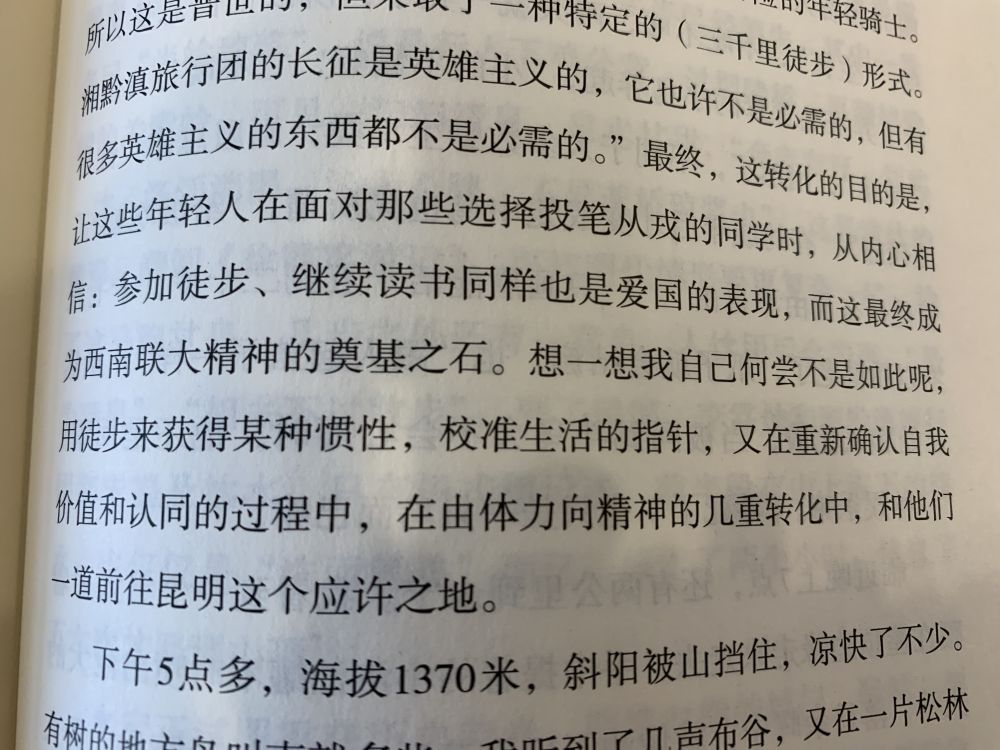 故而,推荐大家这本好书,为著者的勇和笔墨,为西南联大湘黔滇旅行团所遭受的艰险。引述一句话来说徒步旅行的意义:“用徒步来获取某种惯性,校准生活的指南,又在重复确认自我价格和认同的过程中,在由体力向精神的几重转化中,和他们一道前往昆明这个应许之地”。