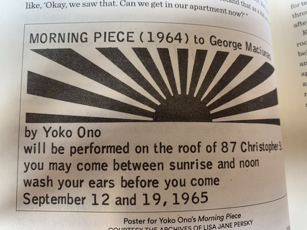 另东村,在1960-70S,是各路艺术家聚集之地,因房租便宜(艺术家经常是三十块一个月租公寓,相互住得很近)。由此发展出各种演出场所,各种音乐派别,实验戏剧/实验音乐。我看照片,那些大名鼎鼎的音乐人,那时都是不拘小节的年轻人,讨论起艺术来不眠不休,这也是美国音乐大发展且引领世界风潮的时期(如我看到约翰列侬日裔太太小野洋子展览海报,看起来她本人是很有创作力很有魅力的人)。