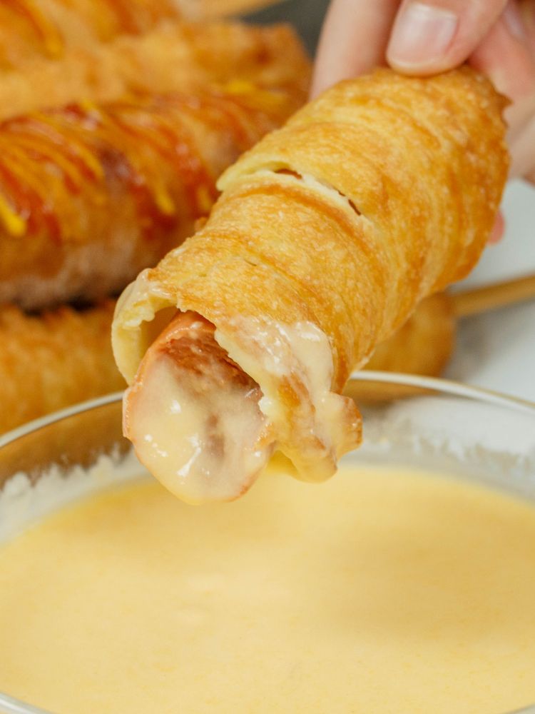 韩国街头美食现在在网上很火,之前试过一个改良版的玉米狗,面糊改成发面,还在里面加了奶酪。这次尝试一个魔改版的,西班牙油条狗,外面的面改成了西班牙油条churro。这个做起来比一般的玉米狗麻烦一点,churro本身做起来就更麻烦,然后因为要有churro的形状,必须要把它一圈一圈挤在热狗的外面,不能直接拿热狗往面糊里沾一下完事了。炸好后沾上肉桂糖粉,配上番茄酱和芥末酱吃。口味乍一看感觉略奇葩,不过吃起来还不错,挺满意。如果和之前做过的美式玉米狗和韩式玉米狗比起来的话,这个我会排在第二名,第一韩式玉米狗,美式最后。我还是比较喜欢发面的面糊,特别是韩式玉米狗面糊上还加了面包屑和炸土豆,不是一般的脆。而且里面还可以加像奶酪这样别的东西。西班牙油条狗如果你想加奶酪也行,不过因为外表的面糊层很难完全封口,炸的时候很有可能会有缝,奶酪会流出来。