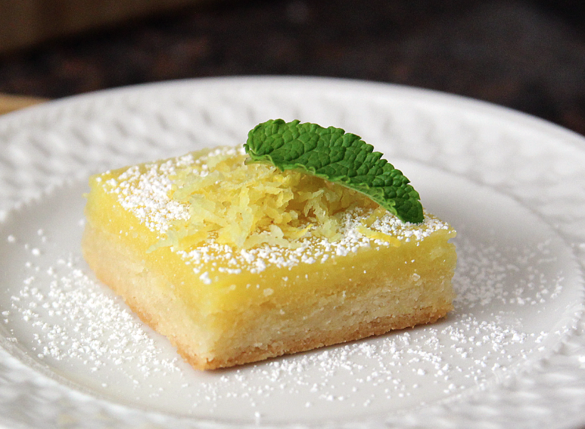再烤20分钟,切24块,加Confectioners’ sugar as needed. Lemon wedge and a mint leaf for garnish