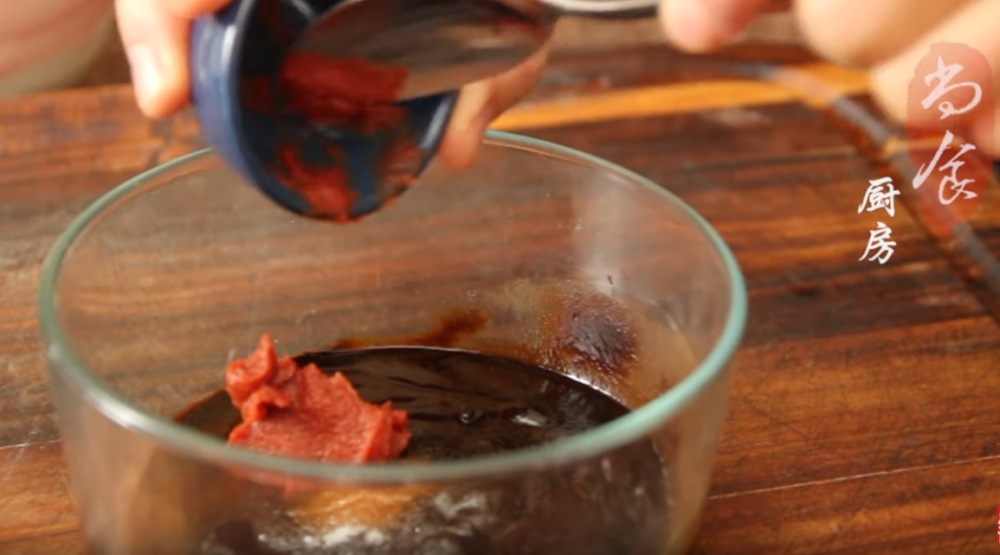 拌甜面酱:甜面酱100g(先尝尝咸度适当增减)、葱姜水适量(2tbsp)、蕃茄酱1 tbsp、酱油1/2 tsp、糖1/2 tsp(如果甜面酱较咸则不加酱油,糖增至1tsp)