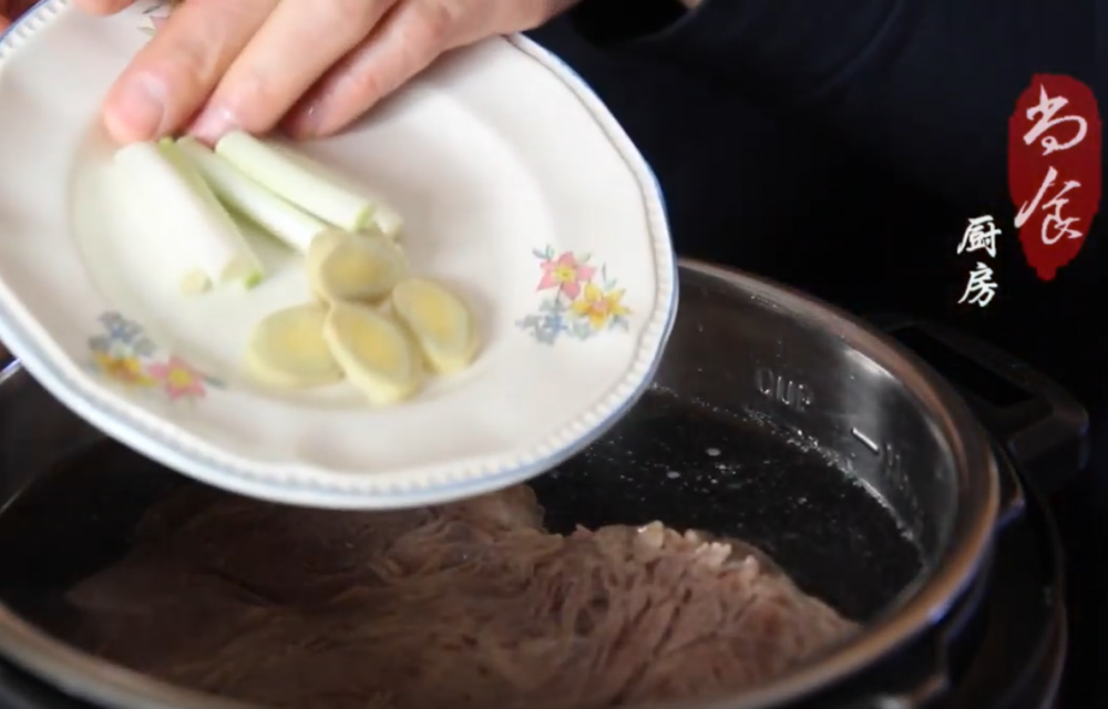 汤头只放焯过水的牛肉和葱姜
