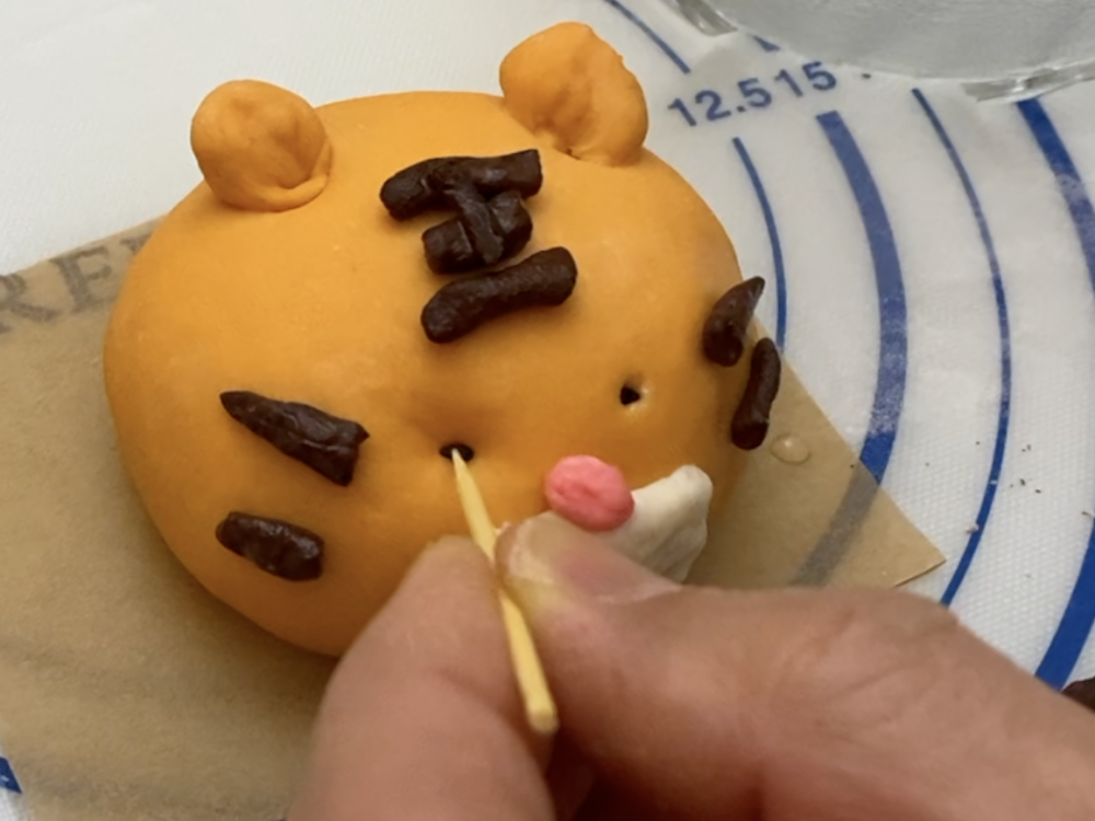 面团中加了一点食用色素做成粉色面团做鼻头