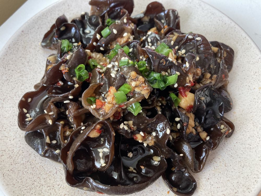 在韩国超市买了黑木耳,想吃凉拌黑木耳,还想吃拌面条,试了试用常见调料做个凉拌汁。凉菜我习惯多加蒜,所以用了一头蒜,热油炸过很香不辣,有点出乎意料。
