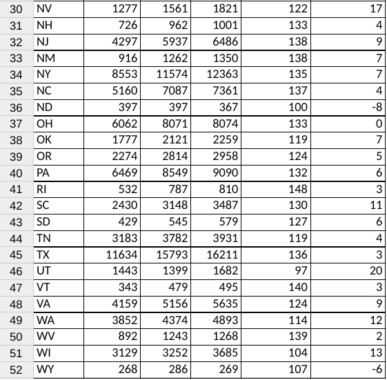 先解释一下每列的题头:State是州名,RegFed18是联邦统计局给出的2018年每州的注册投票人数,RegSt18是每州自己统计的2018年注册投票人数,RegSt20是每州自己统计的2020年注册投票人数,这三列的数字都是以千为单位;%RegSt/Fed是2018年州内注册率和联邦注册率的比率=RegSt18/RegFed18,%RegGrowth是注册增长率=(RegSt20-RegSt18)/RegSt18。后两列都是百分比。