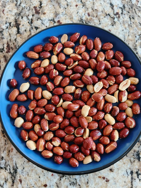 1. 花生300克左右,几滴菜油先拌匀。炸锅350F预热5分钟。空炸8分钟。