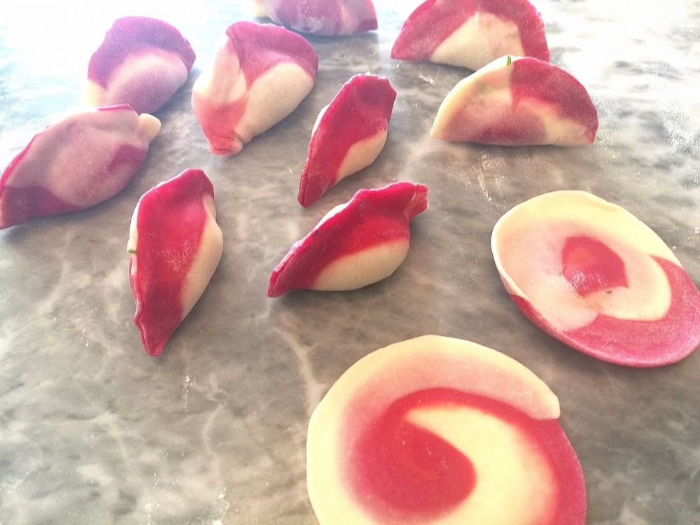 今年的春节和情人节只隔两天, 所以就包了这一批双色饺子,既过年又过节。红色饺子皮是用的红菜头汁和面, 调制了两种饺子馅, 一种就是最传统最经典的猪肉白菜饺子馅, 另外一种用了我自己种的豌豆苗,香菇加猪肉馅。