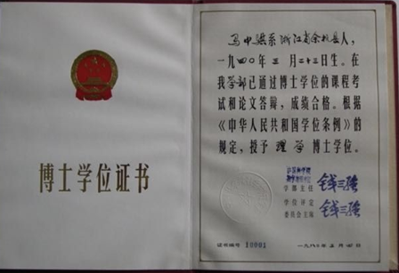 图二 首批博士之一马中骐的博士学位证书