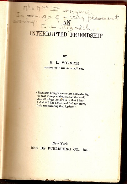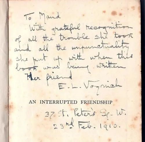 笔者十年前得到的一本英文书:AN INTERRUPTED FRIENDSHIP (《中断的友情》),是《牛虻》(The Gadfly) 作者Ethel L. Voynich(伏尼契,1864-1960) 的另一著作,确切地说,是伏尼契为她自己的小说《牛虻》写的续作。