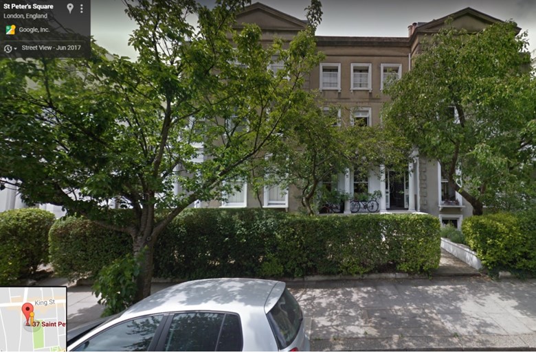 最后,为满足看官的好奇心,笔者就带您按图索骥地去瞅一眼作家伏尼契夫人的旧居。下图是从谷歌地图的街景中截取的 “彼得广场西街三十七号” (37 St. Peter’s Sq W.) 照片。绿化未显古旧,房舍却貌似簇新,未知是仅仅给翻修过 (英人惯玩的旧瓶装新酒把戏),还是推倒重来过?这样的排屋 (Townhouse) 在大伦敦属于中等偏下的档次,况且在一次大战之前该地还处郊外,不会是富豪区的豪宅或者高尚区的雅舍。于是笔者产生了一个疑问:彼时的伏尼契夫人是如何涉足蓝血阶层,又是如何体验贵族生活,来成就她在东方国度中遐迩闻名的《牛虻》?无论怎样,111年前,在此地点她写下 “To Maud ……”,应该是错不了的。