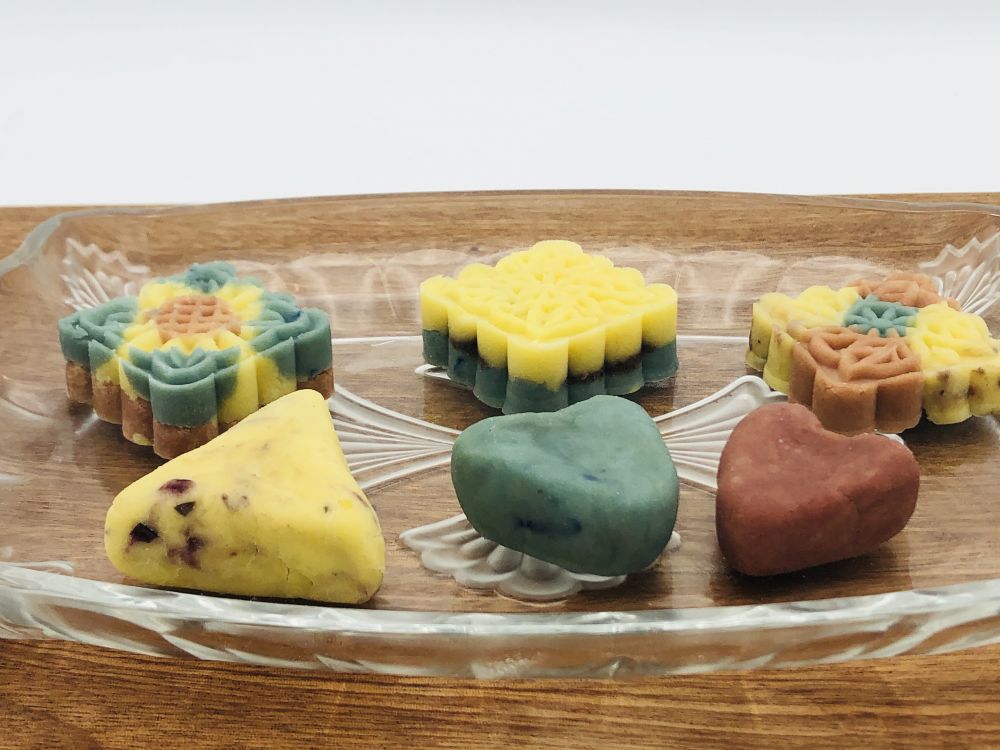 锅里少许油中小火炒干绿豆泥成不粘手的泥团,蔓越莓切碎拌入部分绿豆泥。 其余分几份加入适量果蔬粉调色。模具涂油压模造型,颜色随意搭配,份量多少不用精确,按喜好压出不同厚度。可以包入红豆沙馅。没有模具揉几个圆球或随意捏成方形,三角形都好看。