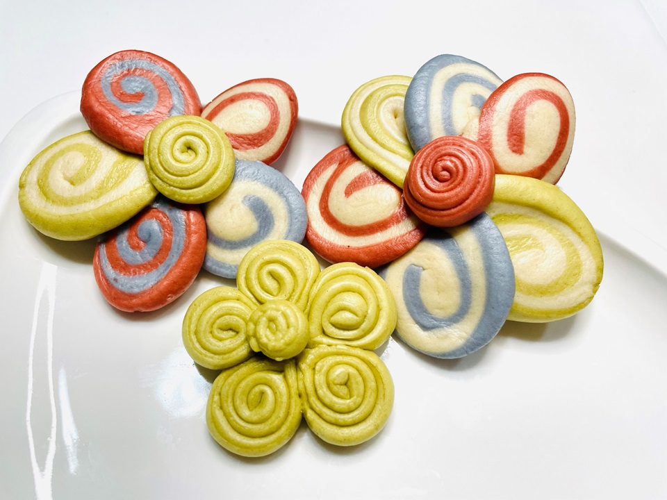 面团:中筋面粉200克,牛奶 105克,酵母1/2 tsp,椰子油3克 红曲粉,菠菜粉,蝶豆花粉适量调色 揉面机揉面10分钟,分割,调色,造型,发酵40分钟,蒸12分钟,关火5分钟取出