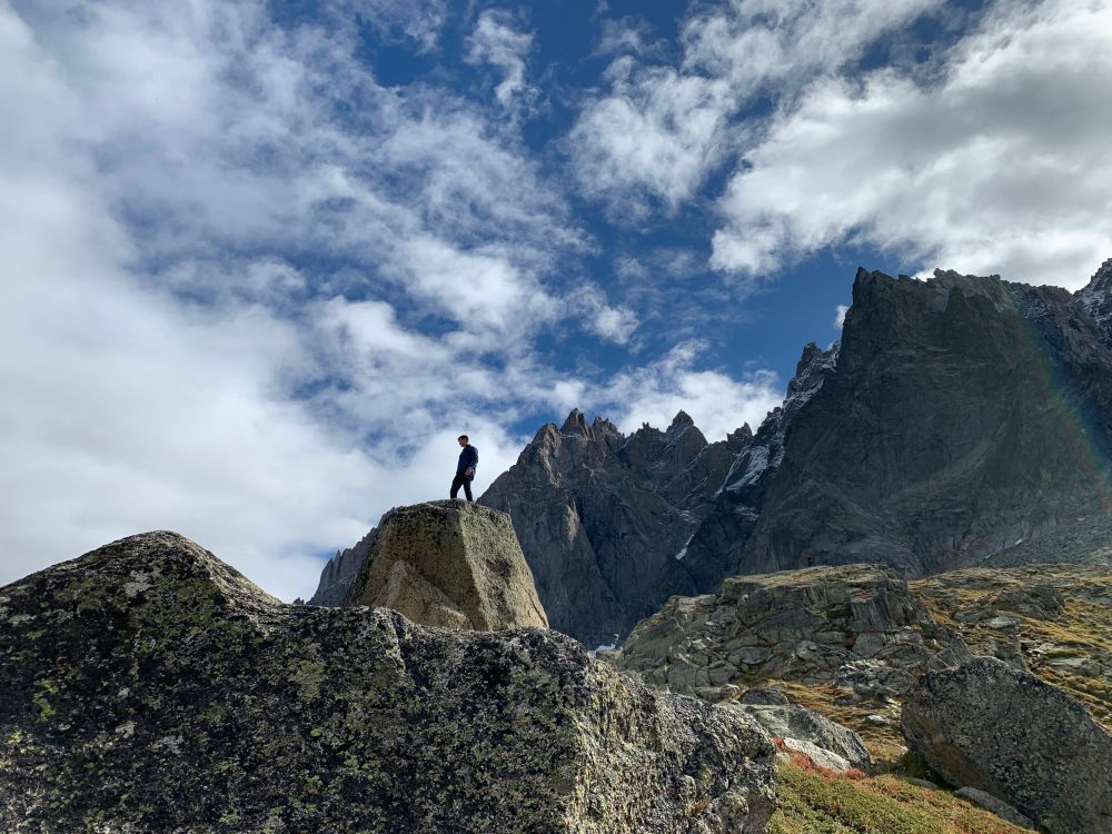 在2300米的地方徒步去了冰川,沿途路不是很好走,有几小段得手脚并用。一个人在冰川边上吃了些零食,坐了会儿,转了会儿,就下来了,因为时差因为冷,一脸倦容。快到缆车站时,找到人拍了照