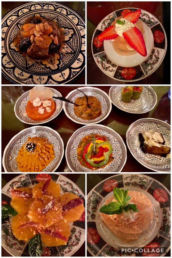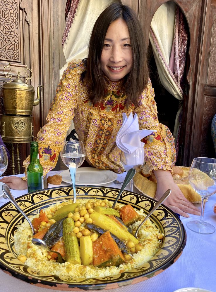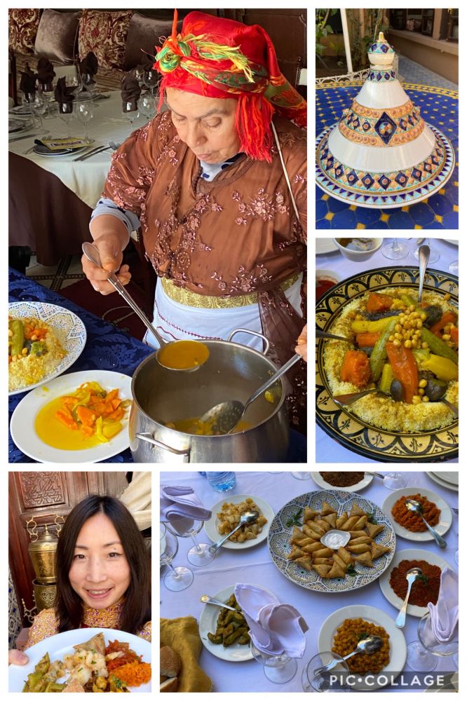在马拉喀什的第二天一早,我们穿过晨曦中的清真寺,领略旧城里的市场的风情。那儿有数不清的店铺,是摩洛哥最大的集市。富有异国风情的各种商品,生动的市井生活,让我们眼睛都忙不过来。随后逛了巴希亚皇宫(Bahia Palace)。“巴希亚宫出自19 世纪末阿拉维王朝一位达官之手,是马拉喀什现今保存最完好的古迹。这座拥有 150 多间房的大宅院里面同样是姬妾成群,孩子近百,都出自一个爹。喜欢那儿的彩色玻璃窗,让光和影好一阵游戏,然后又去看了一个不值得一去的皇陵,接着拜访了犹太人聚居区。中午去旧城里的一家餐馆上摩洛哥美食课,同时吃中饭。同样是进入一道不起眼的门后,马上到了一个别有洞天之所在。看了今天主食couscous 的制作过程后,就暗下决心坚决不做,太麻烦了!中饭每道菜精美,环境富丽堂皇,有宫宴之感!