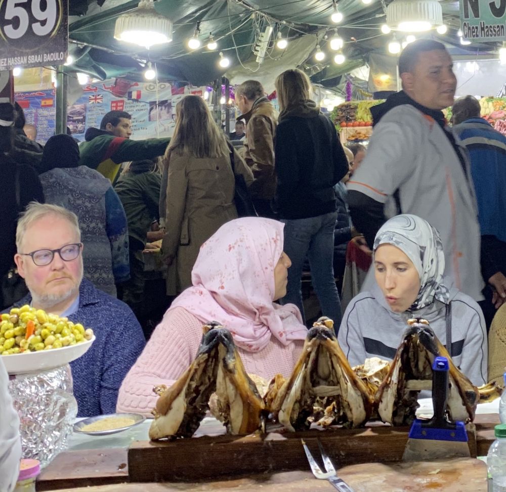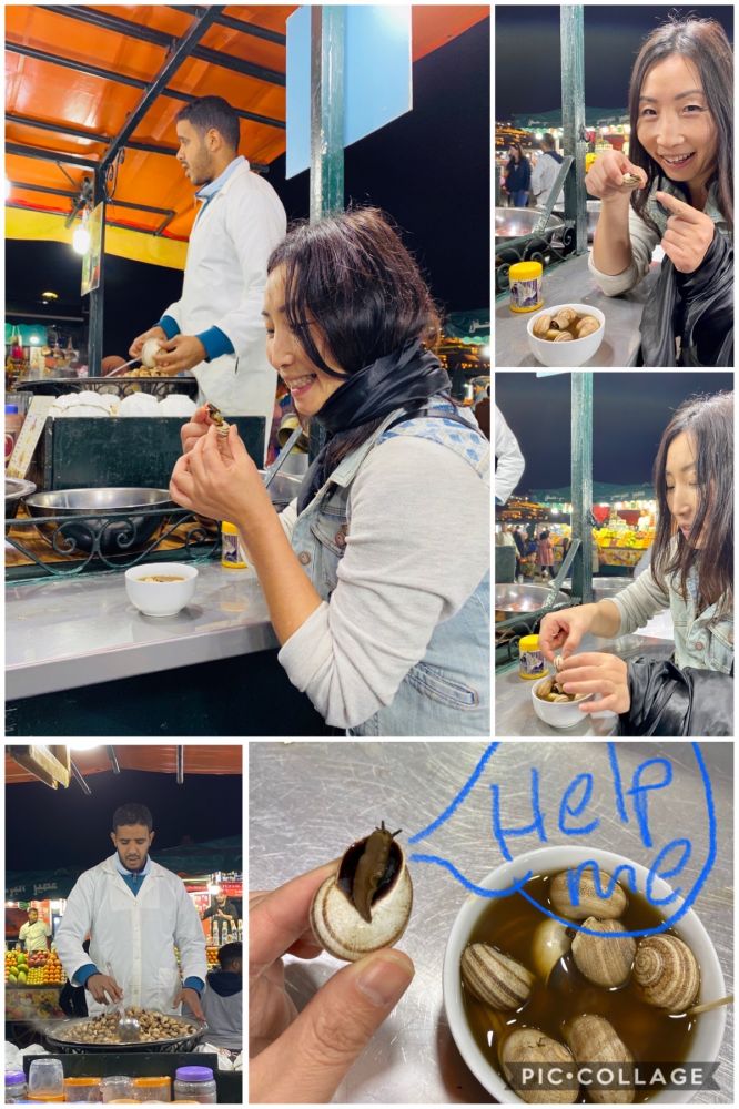 在来摩洛哥之前就慕名这个夜晚的热闹的大排档,对里面的蜗牛,羊头肉早就挂在心上。1美元的一碟蜗牛,特殊的蜗牛的土腥气夹杂着香料的味道迎面袭来,看着那完好的两根小触角,实在下不去口。坐在身边的带着头巾的美女,文雅地吃着,慢慢抿着汤汁,一脸无比享受的样子,于是也学着样子吃着肉,喝着汤。蜗牛的口感软软的,没有嚼劲还带着土腥气,比螺蛳肉差远了,汤汁有着浓浓的五香味道,还行。