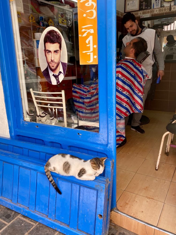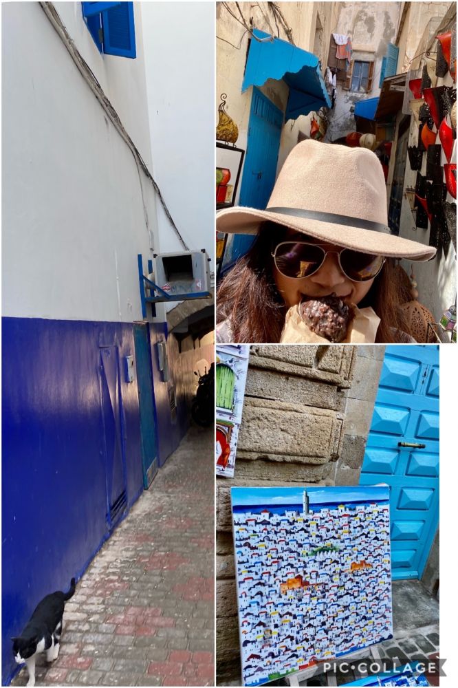 到了Essaouira后,海风袭来,美丽的小城,真不觉得是非洲!到处都是幸福地埋头吃鱼的猫。离海越近,猫越肥。小城白蓝两色,艺术气息浓重。挤在当地人中赶鱼市让我快乐无比!看着各种鲜活便宜的海鲜,觉得空气都是富饶的。吃了路边现烤的海鲜,烤架上剖开两半的大虾尾巴居然还在动!那大大的活海螺,就地做成生鱼片,才1美元!第一次生吃了海胆,半美元一个,用小勺舀进口,一口甜香。逛着城中的巷陌,一处一景,恋恋不舍。正独自一人沉溺于风景时,一当地阳光青年羞涩地上前问我,你寂寞吗?“非常非常寂寞!“请你吃中饭好吗?“”谢谢,我时间很紧,马上得回旅行团。下次好啦!”于是挥手道别。不禁笑开,好可爱的插曲!走过这么多地方,Essaouira无疑是最好!
