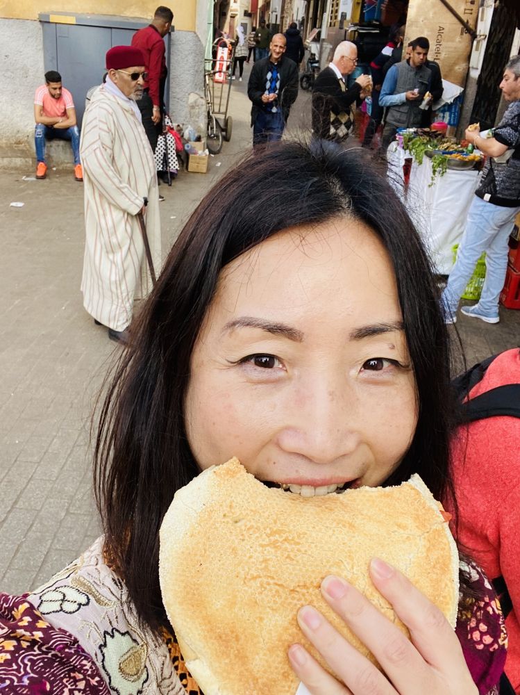 第二天早上我们从卡萨布兰卡到首都拉巴特-Rabat。一个多小时的车程,发现沿途挺整齐,挺西化的。到了Rabet, 入住后,步行由城墙分隔而开的新、旧两城,新城在外围,现代化的小区,不少国家机关大楼,城内的旧城-Medina,又如另外的一个世界,如30年前的中国。那儿仿佛是猫的世界,各种各样的猫很有主人姿态。估计城中老鼠无法遁形。沿着旧城散散逛开,入眼多是白色建筑,清真寺散布其中。不时传出宣唱声。虽没觉得城市有多干净,但还算是整齐有序的。谈谈吃吧! 在旧城逛的时候,到处是街头食摊。忍不住买了一个馕夹菜肉(我起的名字)。 里面有一个煎鸡蛋,一个大海椒,一块烤茄子,一块炸土豆,一片煎炸鱼。这么多东西,加上调料,都消失在大大的馕饼里。才1美元。小哥的手不带手套,又是抓钱,又是抓菜填入饼中,我索性不看。说起来奇怪,整个行程里, 我路边摊吃了个遍,却没有拉过肚子.平日里,我可是最容易吃坏肚子的那一个。