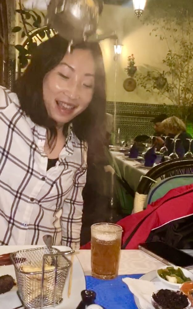 晚上去了一家地道的摩洛哥餐馆。和同伴一起分享了烤牛肉串,羊腱塔吉锅,还喝了著名的薄荷茶。塔吉锅的味道很好,不知用了什么调料。薄荷茶从高处远远倒下,香气四溢,很好喝。我也一试。
