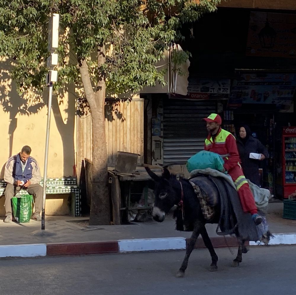 古老的城市,环卫工人用毛驴拖着一袋袋生活垃圾出来,全人工+驴工。毛驴和骡子是唯一的运输工具,因为车根本无法在狭窄的巷道里通行。我们经过古城的大集市,人气很旺,见到卖大袋蜗牛的,很威严的裁缝师傅(这儿人习惯买布料找裁缝缝制),肃穆的清真寺,抬新娘的轿子,寻常里巷,还有那手工染坊。
