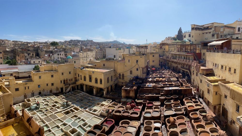 别小看这外表不起眼的古城,打开古老的宅门,你可能会被里面的豪华惊得无语。别以封面评价一本书,同样不要以外表评价菲斯古城的内宅。打开不起眼的外门后,你会惊叹于内宅里装饰的豪华。我们去了地毯店,神学院,木质博物馆,清真寺,看得眼花缭乱,恨不得融进这美丽的花色图案中。在一家同样别有洞天的餐馆吃了地道的摩洛哥美食,我们前往古城著名的染坊。
