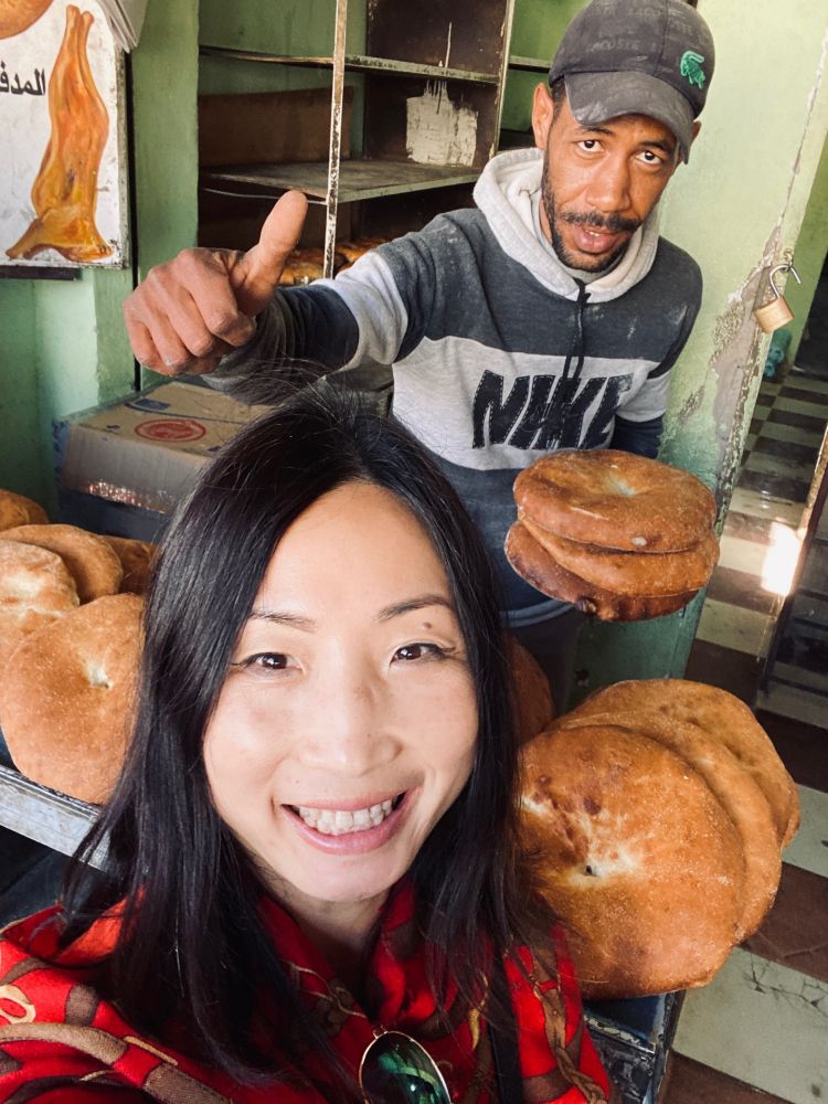 接着去了这儿古老的集市,一切都蒙着一层细沙,让时光的沙漏都停滞下来了。导游说当地人非常保守,不喜欢被拍照。自拍时卖馕的汉子主动求合拍,可见年轻一代慢慢开放。据说这家馕饼店最好吃,导游请大家吃了,热烘烘的刚出炉的馕带着最质朴的清香。