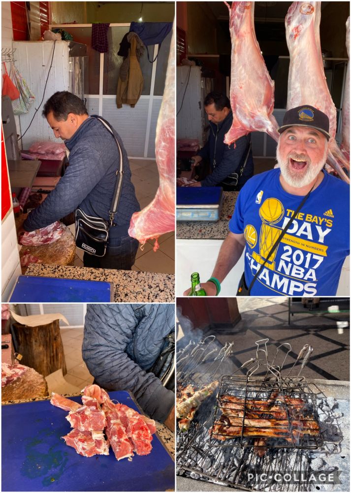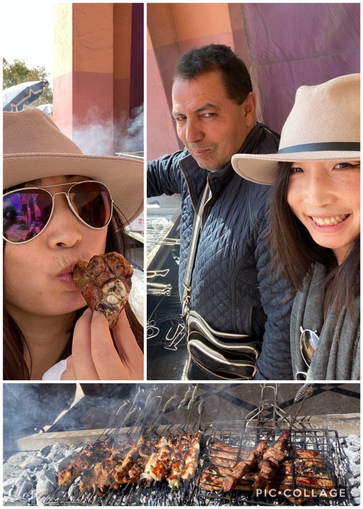 行程的第七天,周三, 2/19/20,从沙漠之城Elford开往皇城马尔卡什 ,路经Ouarzazate过夜。一路上经过很多峡谷,有水流的地方就条形的棕榈树林,也就有了人烟。我们在Todgha峡谷停下,那儿有深纵的峡谷和沿山而下的湍流。谷中桃花和杏仁花正开,有羊群在峡谷河流边饮水,好一个世外桃源!中饭时和一个团友偷偷离队去找羊肉吃,看到一个路边烧烤店,旁边的肉铺挂着几只新鲜的整支羊,我们学着羊叫告诉老板要吃烤羊肉。老板利落地切了几块羊排烤上,那个香啊!才2美元。我们得意地笑!
