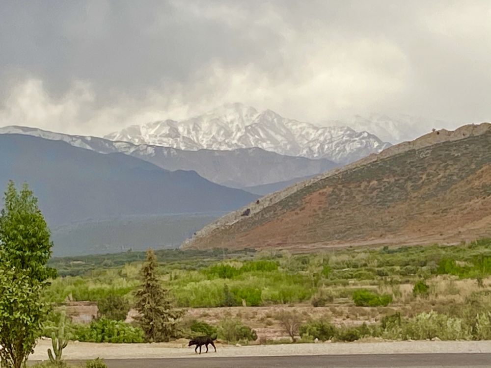 我们中饭就在这条摩洛哥的“318国道”-high Atlas Mountains附近的村落吃了中饭。导游头一天就点好餐,我们一到热腾腾的山羊肉塔吉锅就端上桌了,相当美味。一路颠簸一路美景。如同在一幅出使西域的画卷中。途中惊喜地遇上一小阵春雨,停车集体如厕时,还听到闷闷的春雷声。一条狗在春雨中萧瑟地走着,远处的雪山迷雾愈发蒸腾,不知为何,此情此景定格于我的内心。