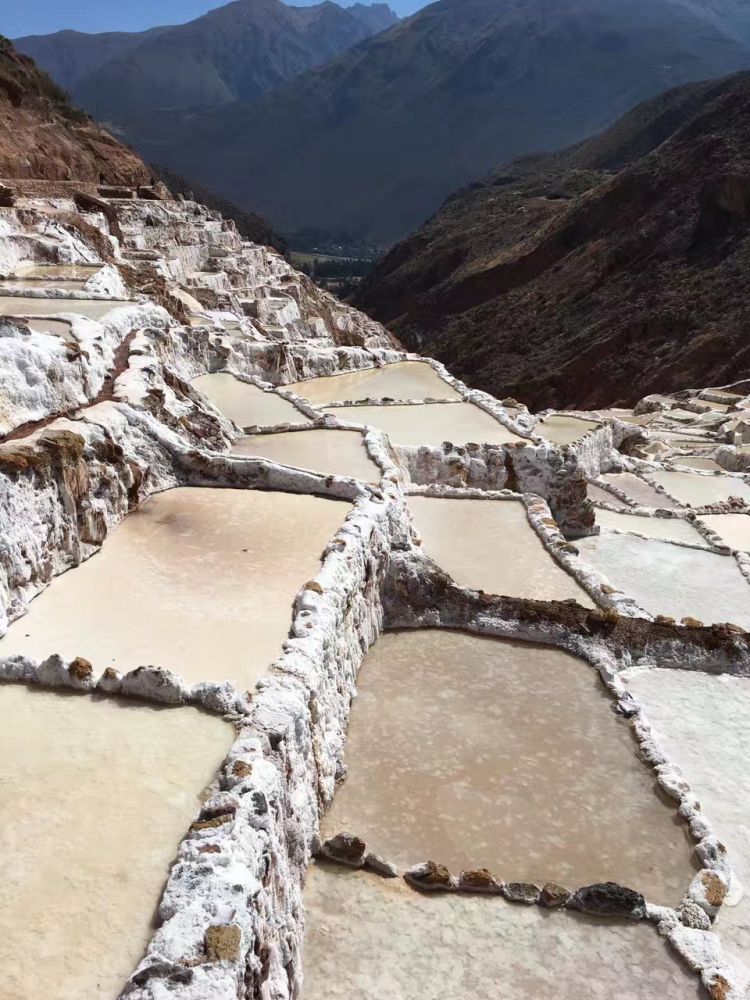 住在欧燕台的第二天,我们包车游览了神圣谷一带。首先是古印加的农业育种基地。巨大的环形梯田可以产生不同温差而培育不同的种子。远处的雪山也静静地为此人工奇迹做着背景。