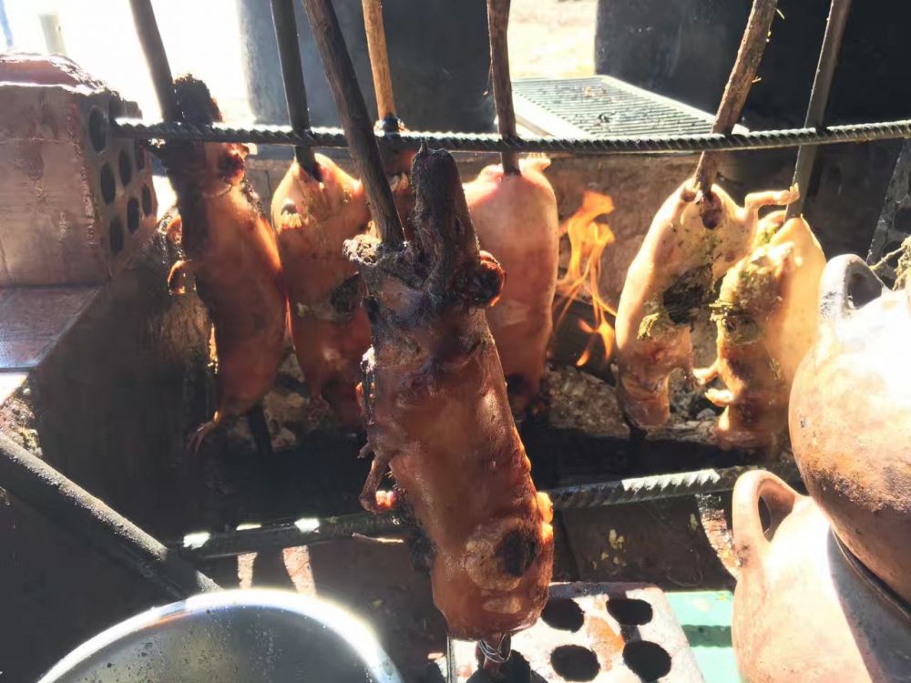 到了中饭的饭点了, 我们特地去秘鲁名菜:炭火烤荷兰猪(豚鼠)。秘鲁人逢年过节才能吃得上的好东西!下图就是满街卖的,喂豚鼠的草。我们特地去当地人口碑最好的一家店。味道如何?很香,皮很脆,肉很进味道。豚鼠肚子里塞满了各种香草料,在炭火上人工慢烤,能不好吃吗?只是心里还是有些...,到底是大老鼠。