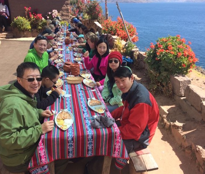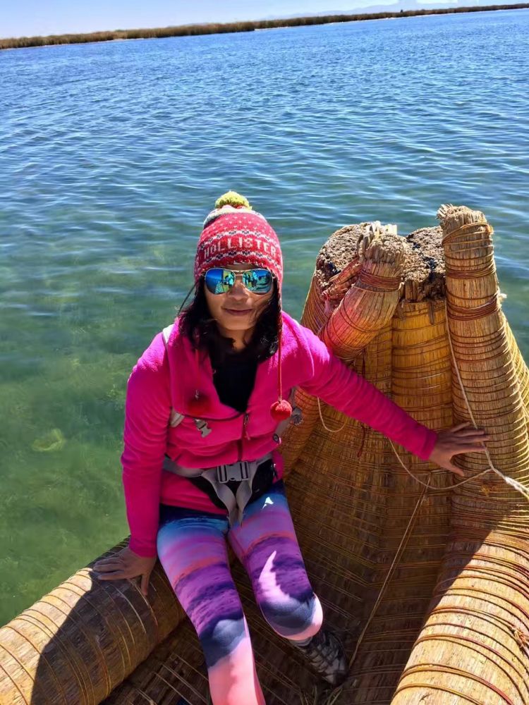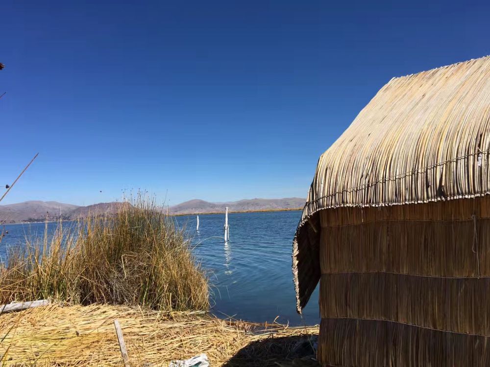坐飞机到达Puno已经是晚上11点。这儿有世界上最高海拔的可行船的最大的淡水湖。的确很大,给人一种海洋的错觉。突然来到海拔4千米,大家多多少少有点高山反应,稍有动作,就上气不接下气。一大早起来就参加了2天1夜游TIticaca 湖的旅行团。我们先去参加芦苇做成的人工漂浮岛,然后去湖中第二大实体岛的当地人家过夜。这个团的导游就是在漂浮岛长大到12岁,再去Puno接受教育,很帅气的一个小伙子。漂浮岛据说是当年印加人为了逃避西班牙的侵略者,用芦苇建成的漂浮在浩瀚的Titicaca湖中一块块栖身之地。脚踏上浮岛,就感觉地面弹弹的,厚厚的芦苇铺地,坐在上面一久,裤子就有水迹。我四处晃悠,偷偷看看岛上房子的内部是什么样子:真只有空空四壁,屋顶还好大一块塑料布,芦苇席上放在一些衣物。我沿着房缘继续探,不小心一脚踏进芦苇铺得比较薄的区域,双脚顿时湿透。只好脱掉鞋袜,如当地人一样光着脚走动。跳上芦苇船,去体会浮岛人唯一的交通工具。芦苇是如此广泛的运用,新鲜拔出来的嫩莖,居然可以吃。到了芦苇荡深处,给每人拔了一根。虽说如黄瓜一样,可真是嚼之无味。这么严酷的生活环境,岛上的孩子依然天真可爱,抱着一只小狗,萌样天成。女儿也抱了一会小狗,两个世界的孩子,在这一刹那有了交集。