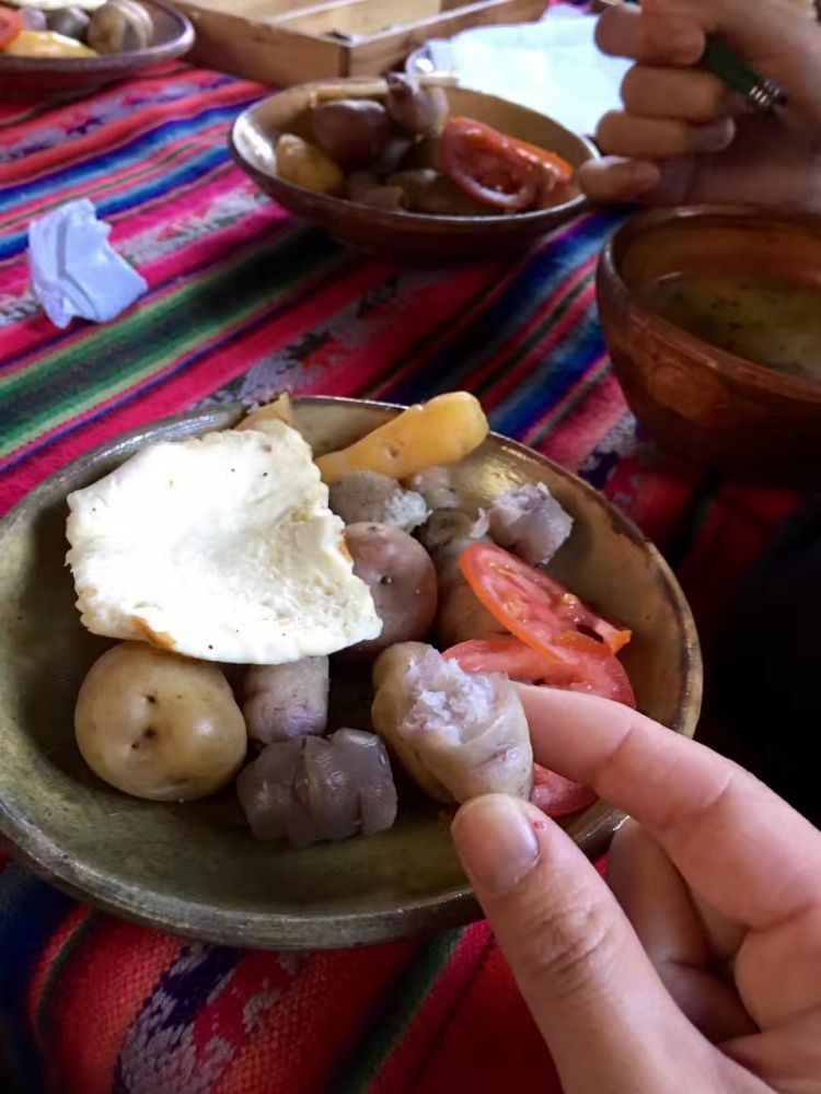 体验了Titicaca岛上原住民的艰苦生活后,我们回到了文明世界,彻底地洗了个热水澡后,直奔Puno的地标--武器广场对面的生意最好的餐馆。每个点了自己心仪的菜,有著名的油炸豚鼠肉,羊驼肉,串烤桂花鱼等等,味道不错!看来大家都只能暂时忍受艰苦生活。