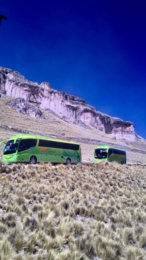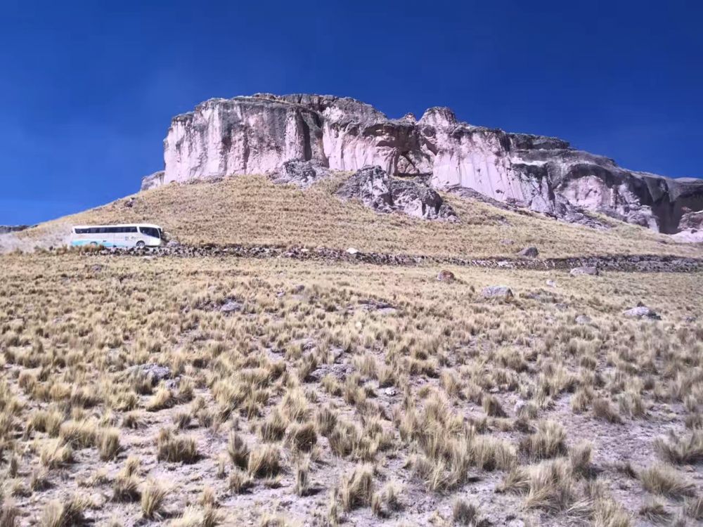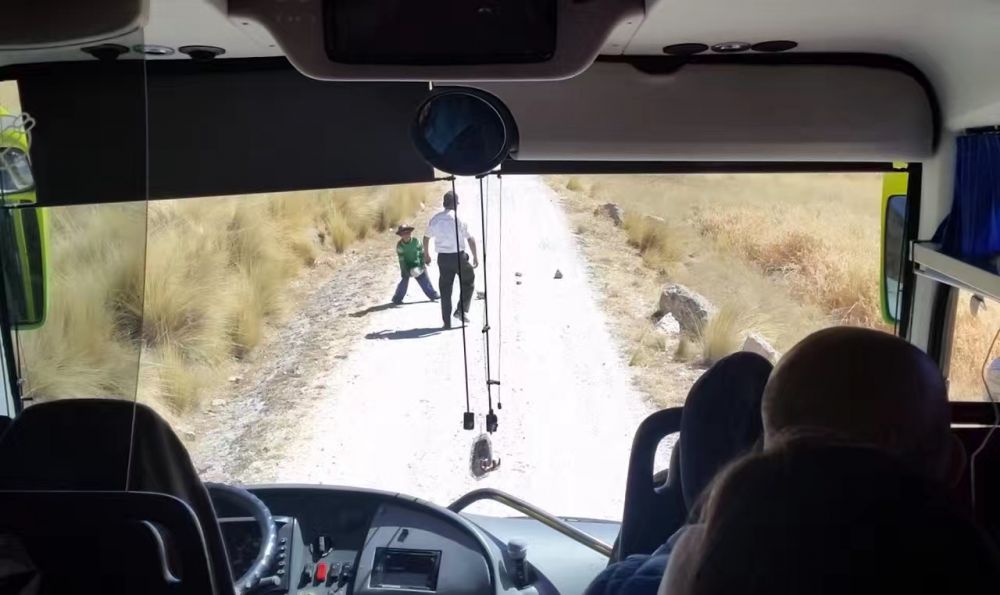 然后因为秘鲁教师大罢工堵塞道路, 大巴开始绕行,没想到连要绕的道也被堵上了。大批旅游巴士都在等。示威者宣称要从昨晚开始堵24小时。有些运货卡车已经被堵在这儿过了夜。我们的导游跳上摩托车,花了大概一个多小时回来了,探出一条崎岖的山路 (一大段贴着悬崖边的狭窄土路,我们坐的可是庞大的德国奔驰大巴啊????)。由我们车打头,众多旅游大巴浩浩荡荡开往不是路的路上。我们谁都不敢睡觉,每当司机惊险地成功在之字型悬崖羊肠道上转过庞大车体时,我们都暗松一口气。身边再美的景色都没有注意。当终于走过这一大段悬崖路后,我们不禁一同向司机鼓掌!