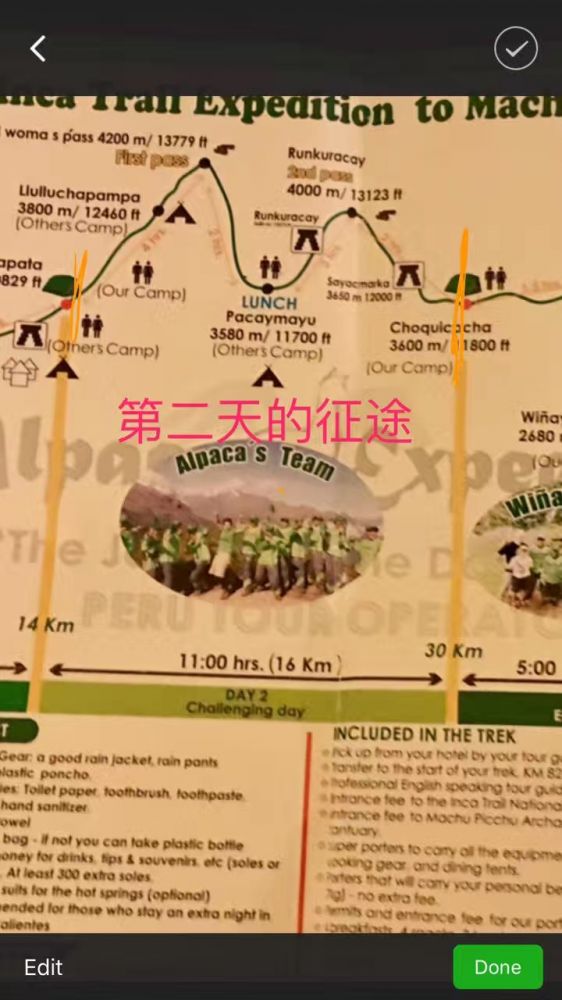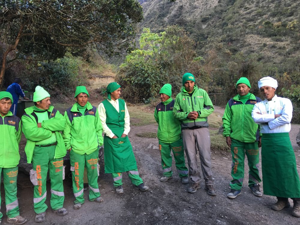 计划已久和盼望已久的四天三夜徒步背包经印加古道到马丘比丘的征途终于开始了。我们一行一共有16名团员,其中我和好友一家就占了7位。剩下9名是来自澳大利亚,荷兰,英国,美国的二十来岁的年轻人,多半是情侣或夫妻。16名团员配有22名脚夫,两名厨师,两位导游。所以一行共42人。在这四天三夜的旅途中,所有的食物,装备都是靠脚夫一路背着,精美的三餐由厨师准备,我们的任务是在导游的带领下徒步而行,所以需要这么多脚夫/厨师让我们得以在荒野中舒适地享受自然。虽说这是一个吃苦受累的旅程,其实离现实的艰苦还是非常远。当然我们对第一天6个半小时的徒步还是跃跃欲试,充满对着高山和野外生活的憧憬。