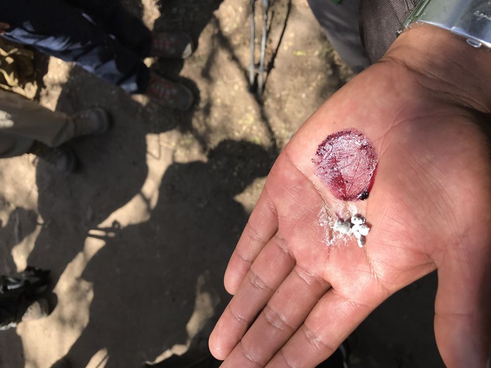 在起点吃了早饭,清点好装备后,四个人神情轻松地合影留恋,不时英姿飒爽地摆拍。导游一路介绍当地的自然生态,并从路旁的仙人掌的叶片上刮下一小撮附着的灰色粉末状寄生虫。用手碾磨一下,灰色居然变成了生动的胭脂红!我们每人脸上都抹上这两撇胭脂红以做记号方便导游辨认。因为同一天有不同的团浩浩荡荡走在同一个路径上,加上脚夫等人每天上路的人数最多可达500人(限额)。也就是说游客每天最多大概有200位的名额。这就说明为什么往往早在半年之前你想要的时间段的名额已经告罄。