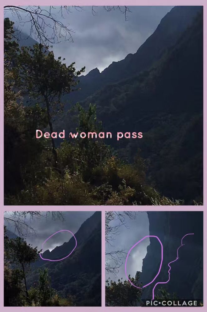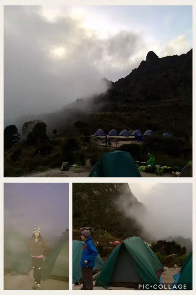 第一天的行程相对轻松,从早上10点开始,走6个半小时的蜿蜒上升的山路而已,中间停驻一下,享受丰盛的中餐。一路有农家相伴,小贩相随。快到营地时,导游指着远处高高的山口说,这是明天要过的山口,也是这个徒步旅程的最高峰:4200米的臭名昭著的“死妇人口“。为什么说是“臭名昭著”呢?因为如此高的海拔,非常难爬,难上,难走!为什么叫“死妇人口”呢?下图是我的理解。将近下午五点我们到了营地,天已经擦黑了。脚夫们早已提前到达,搭好帐篷,做好丰盛的晚餐,列队欢迎每个到达营地的人。帐篷(两人间)对着云蒸雾绕的大山,帐篷外放着两盆热水,第一天即将结束。