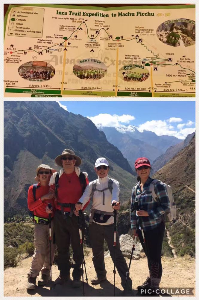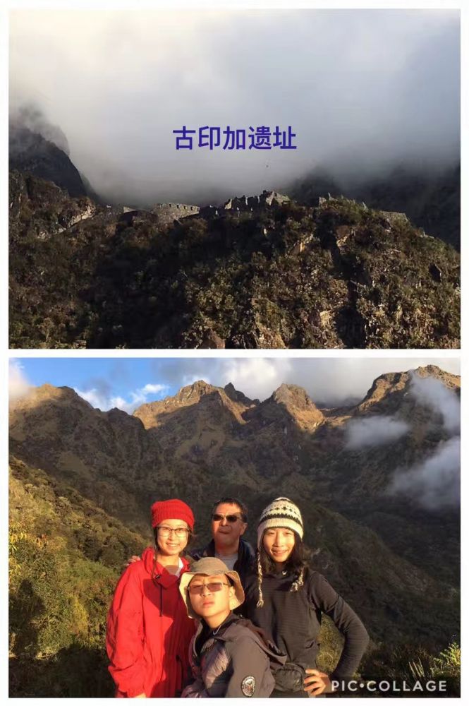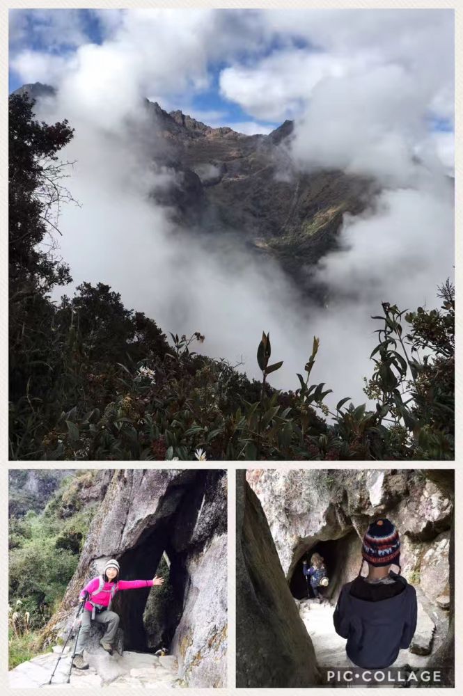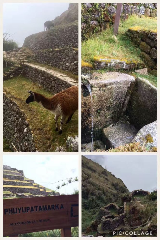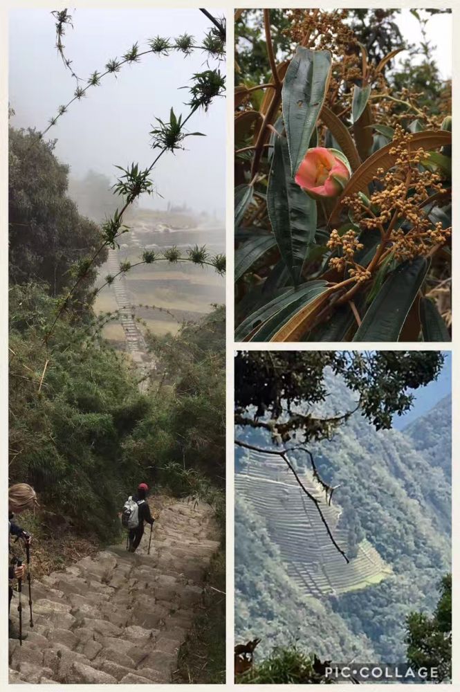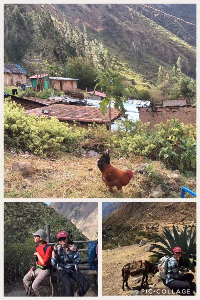 第三天早上更是三点多就起来了,儿子开始拉肚子,继续呕吐,一点劲也没有。全团16人,约半数都病怏怏。早饭几乎没有动,而厕所非常热门,几乎个个都冲向厕所。共同的症状是恶心,呕吐,腹泻。导游说这是高反症状。今天的路程是按正常速度需要5个小时,从海拔3600米降低2680米,落差将近1000米。这对高反症状会有极大的缓解。不过今天的路程依然是爬高和下降相间,要经过全程的最后一个海拔3680米的山峰,也是古印加村落的遗址。儿子艰难前行,已经一天没有吃东西,又吐又拉,连水都喝不了。可是脚下的路依然要靠自己走。好在女儿依然活蹦乱跳,不让我们担心。
